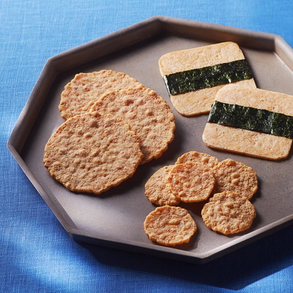【海老焼のり】えび(輸入、国産)、でん粉、砂糖、黒のり、澱粉分解物、食塩、しょうゆ、みりん/調味料(アミノ酸等)、ベーキングパウダー、紅麹色素、(一部にえび・小麦・大豆・乳成分を含む)